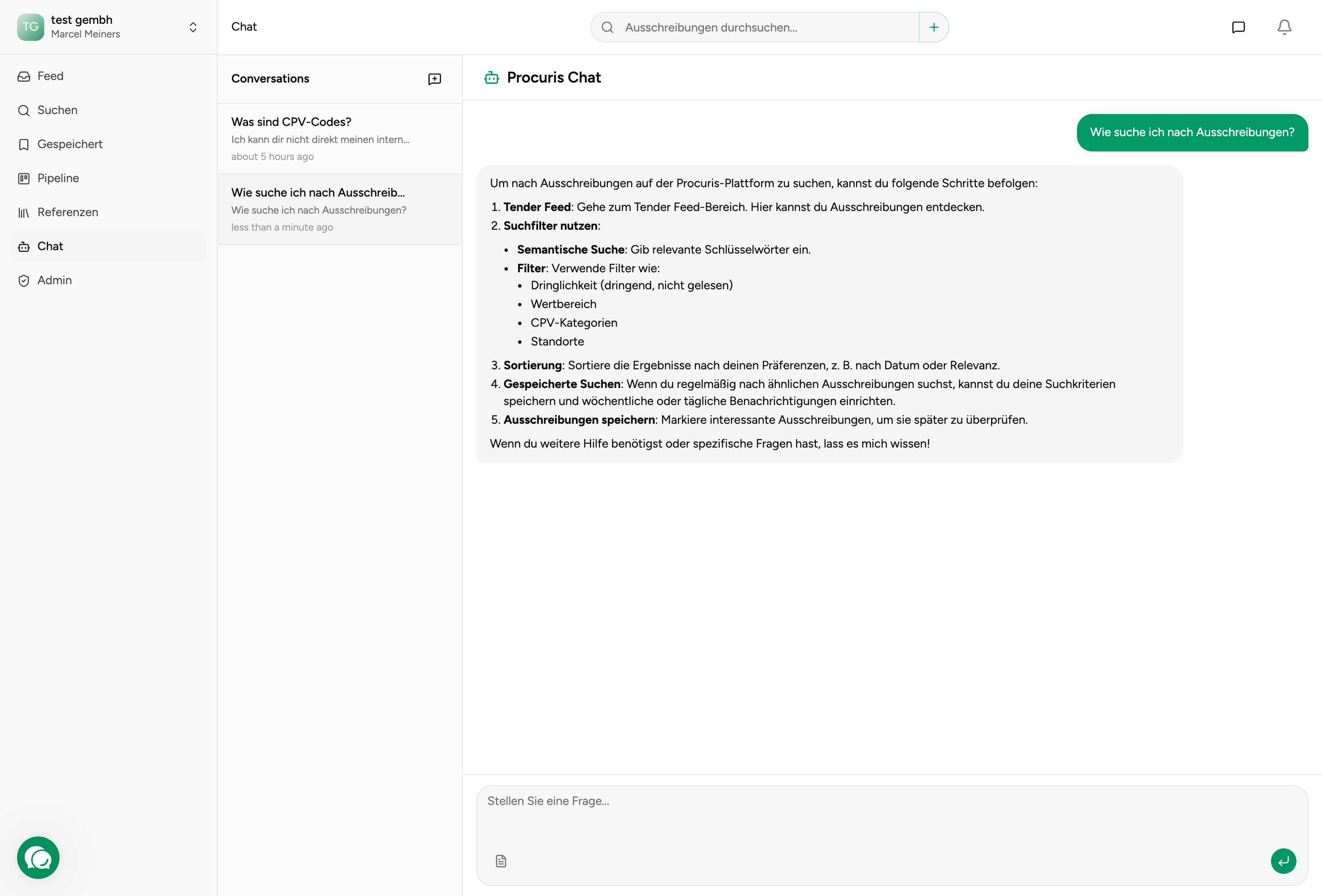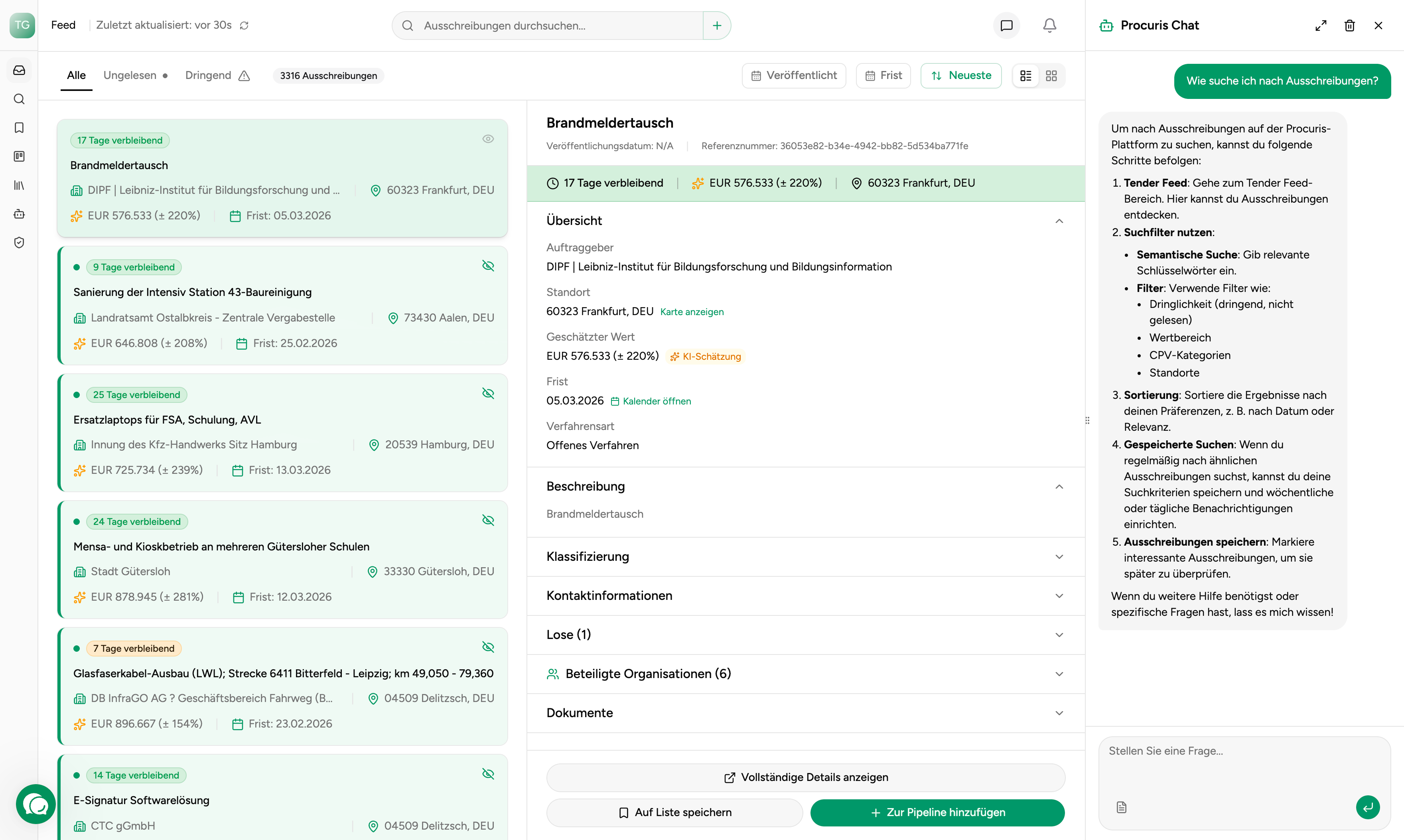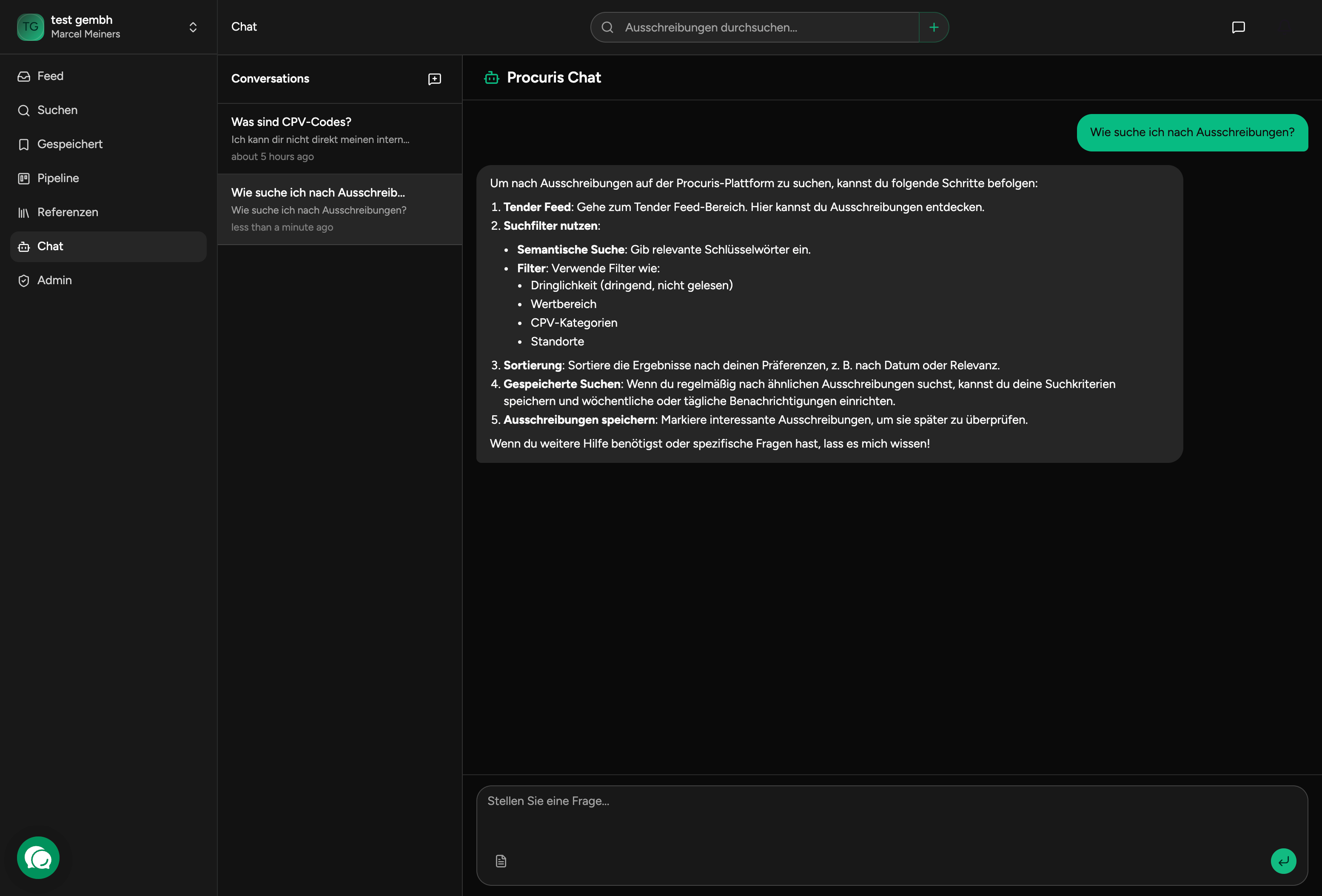 Der KI-Assistent ist ein integrierter Chat fuer Fragen zu Ausschreibungen und zur Nutzung von Procuris.