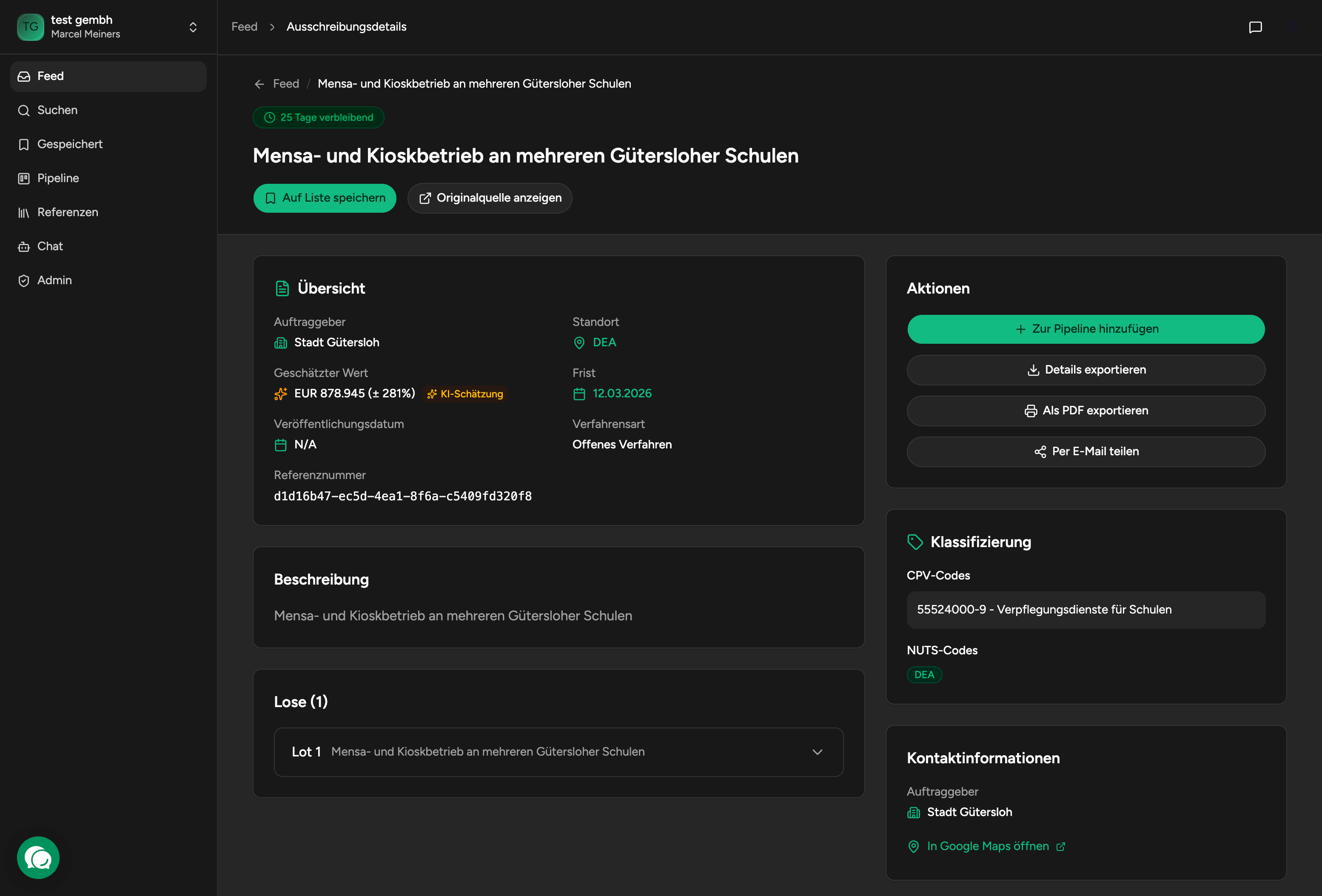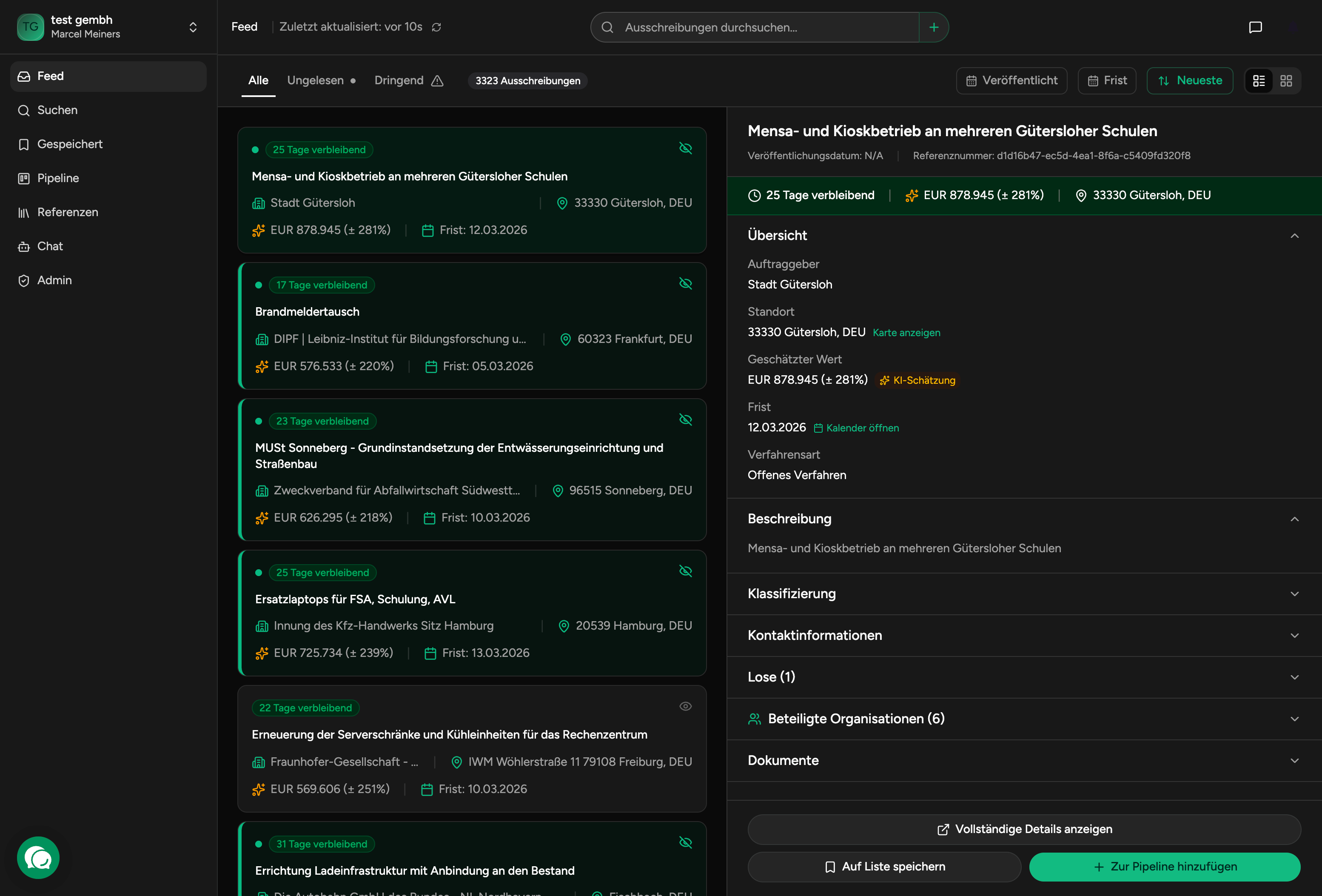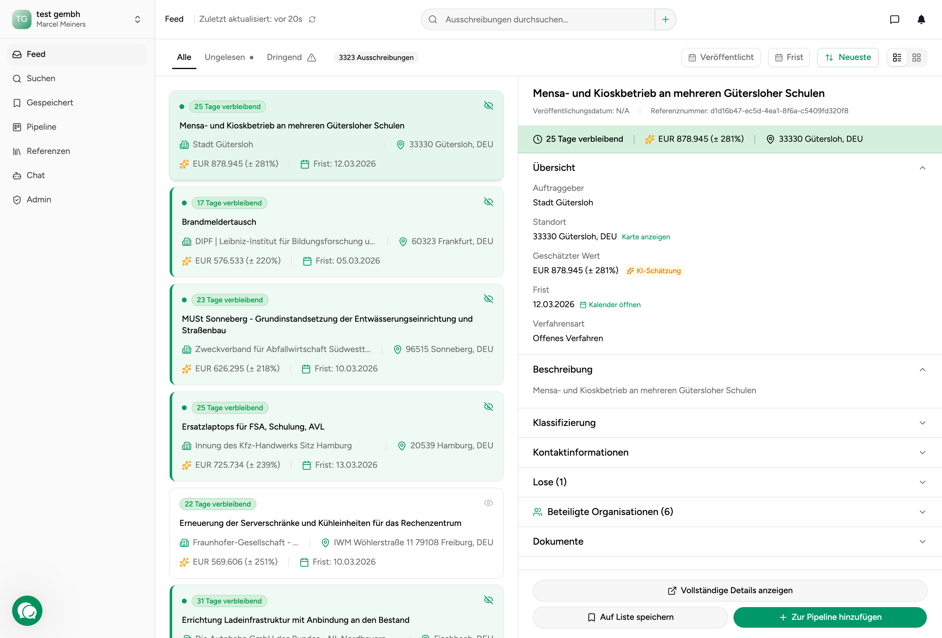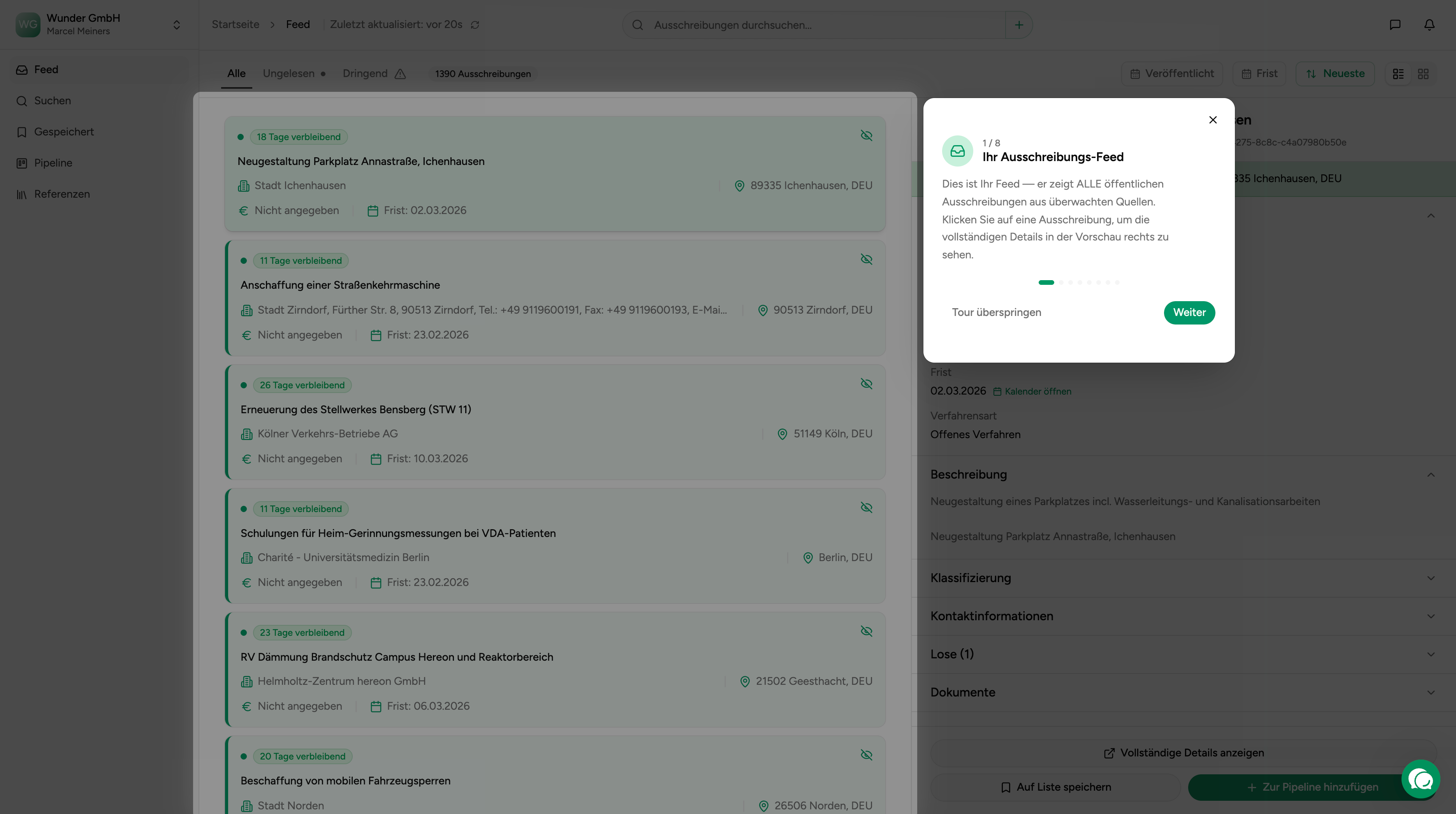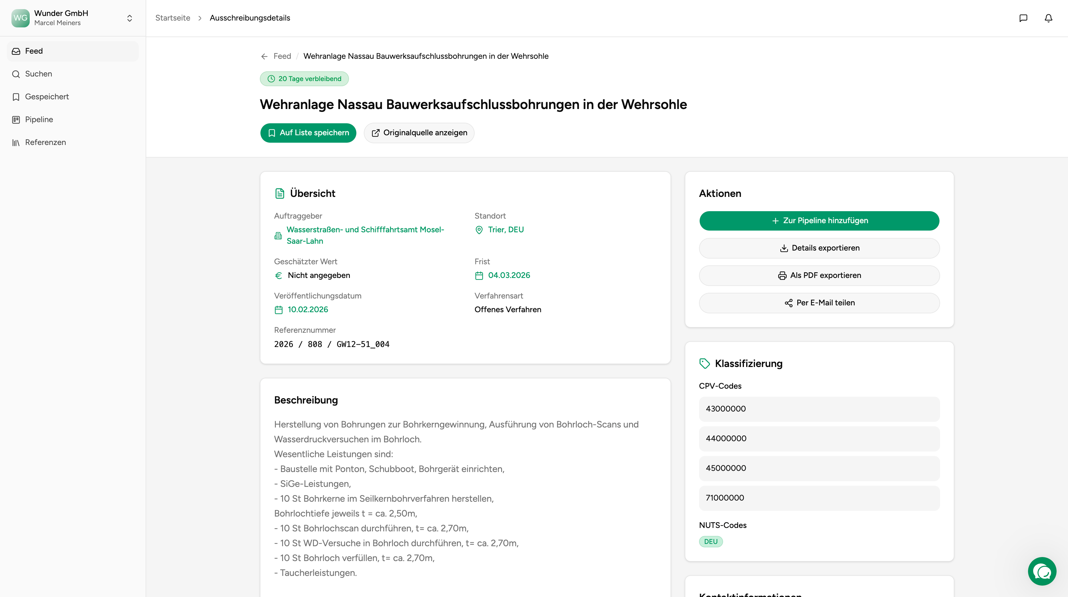 Entdecke Ausschreibungen, filtere schnell und pruefe Details ohne Kontextwechsel.