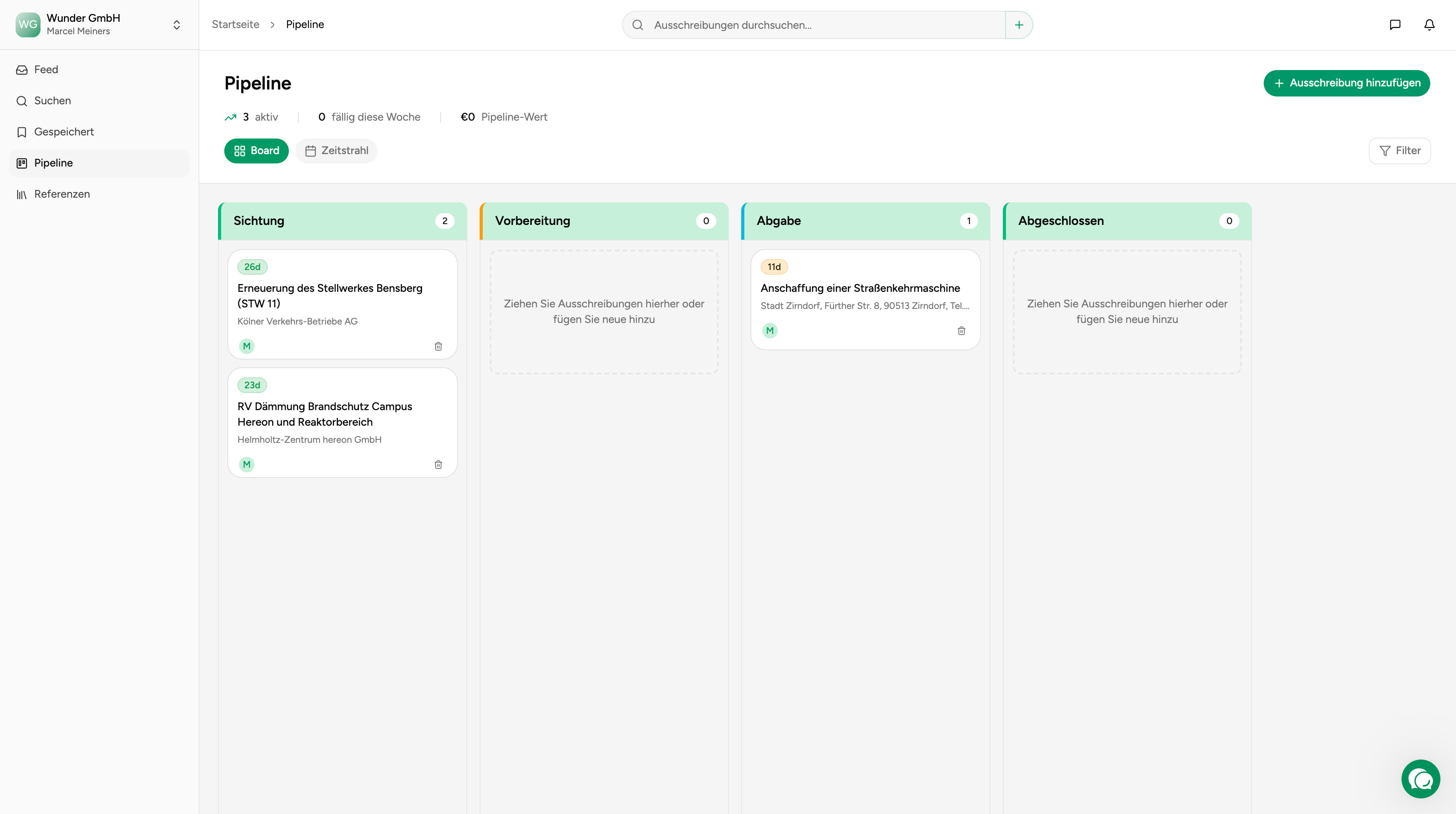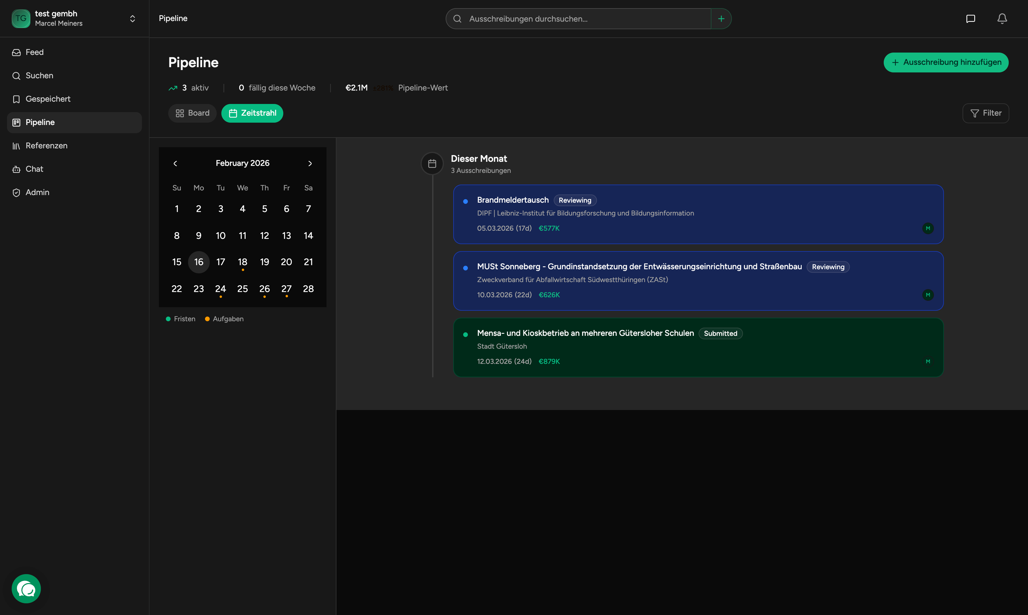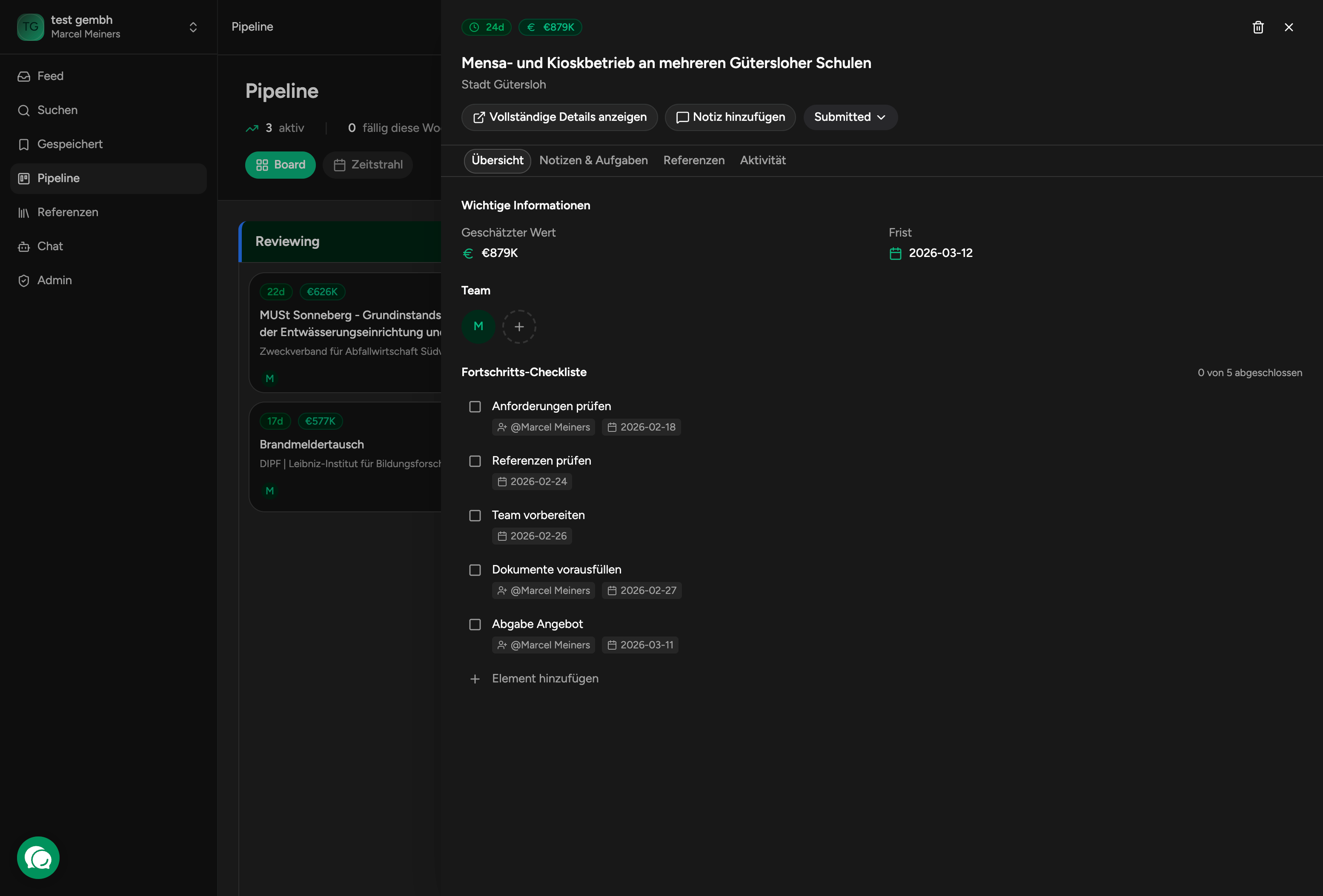 Aus dem Pipeline-Panel kannst du die volle Tender-Detailansicht oeffnen, ohne den Arbeitskontext zu verlieren.