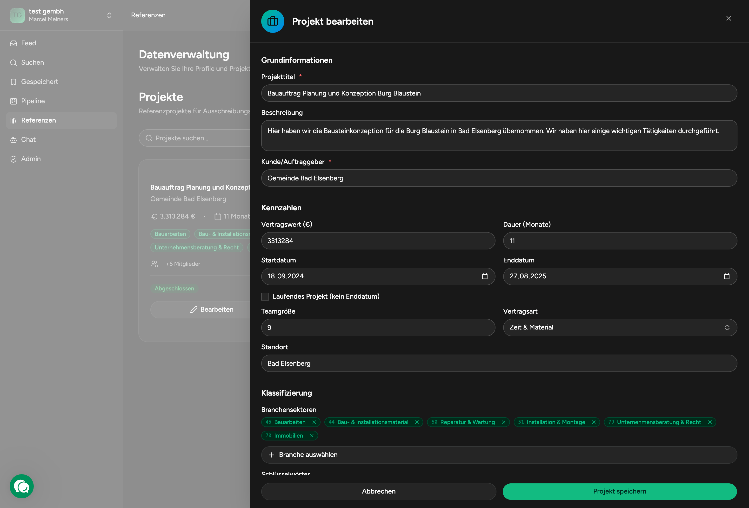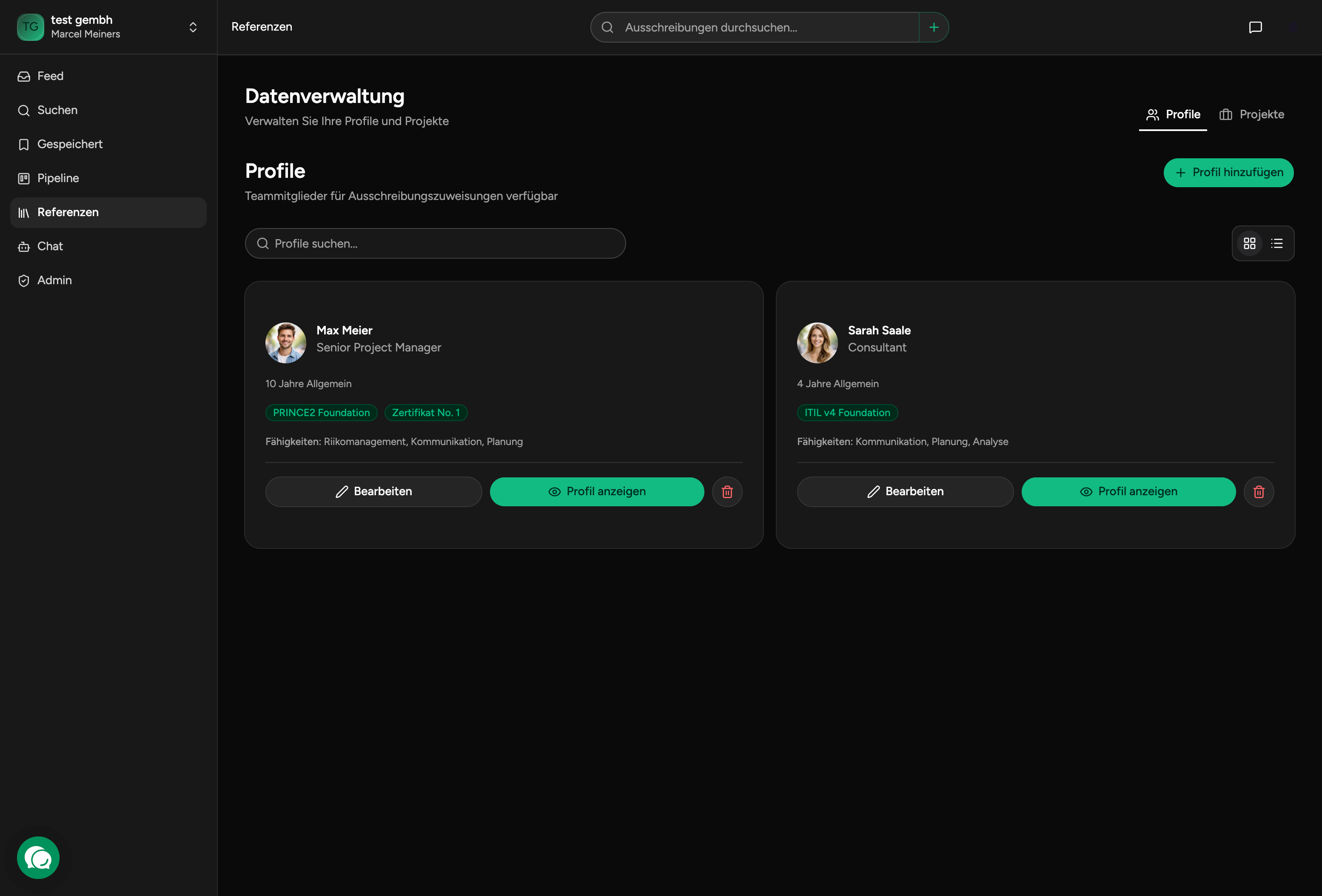 Verwalte Profile und Projekte und verknuepfe sie spaeter mit aktiven Pipeline-Tendern.
