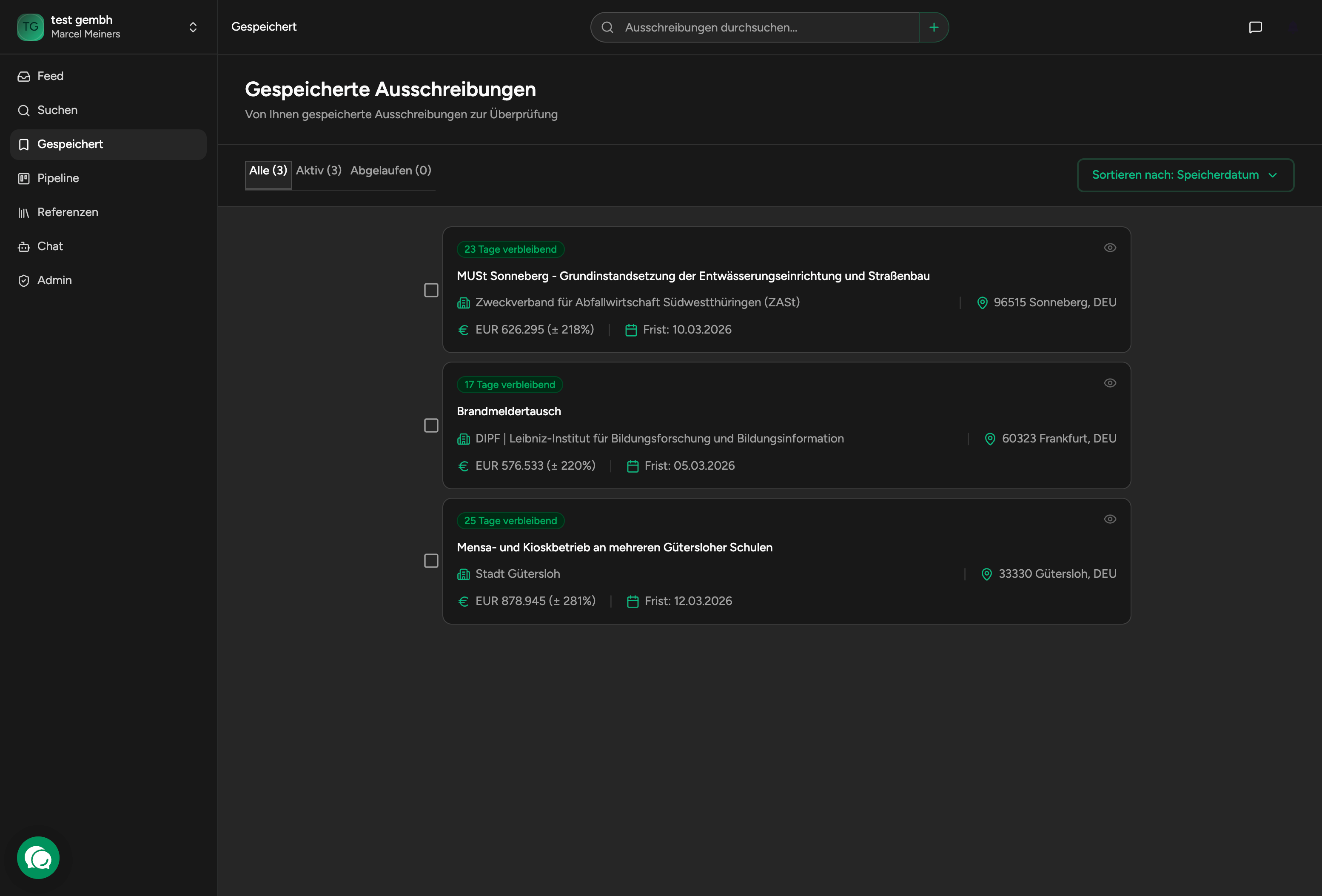 Dieser Bereich ist deine Shortlist fuer Ausschreibungen, die du spaeter genauer pruefen willst.